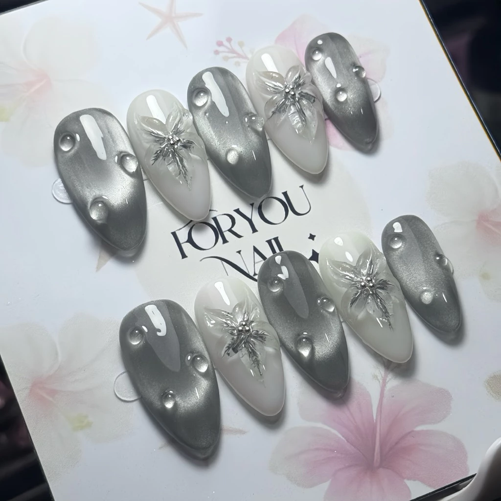 เล็บปลอมเจลปั้นนูนดอกไม้ สีลูกแก้วเงิน แถมอุปกรณ์ติดเล็บ เซ็ต 10 ชิ้น