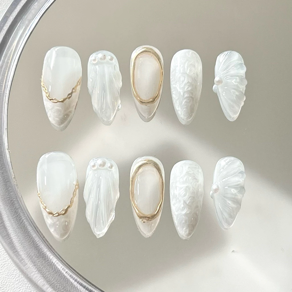 เล็บเจลแท้ 100% เรียบหรู ขาวมุกทอง งานแฮนด์เมด 10 ชิ้น